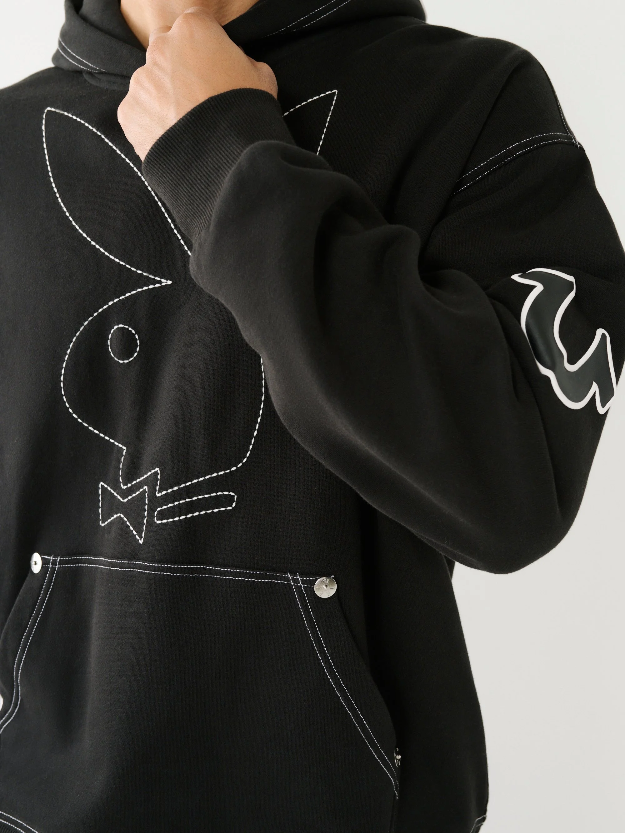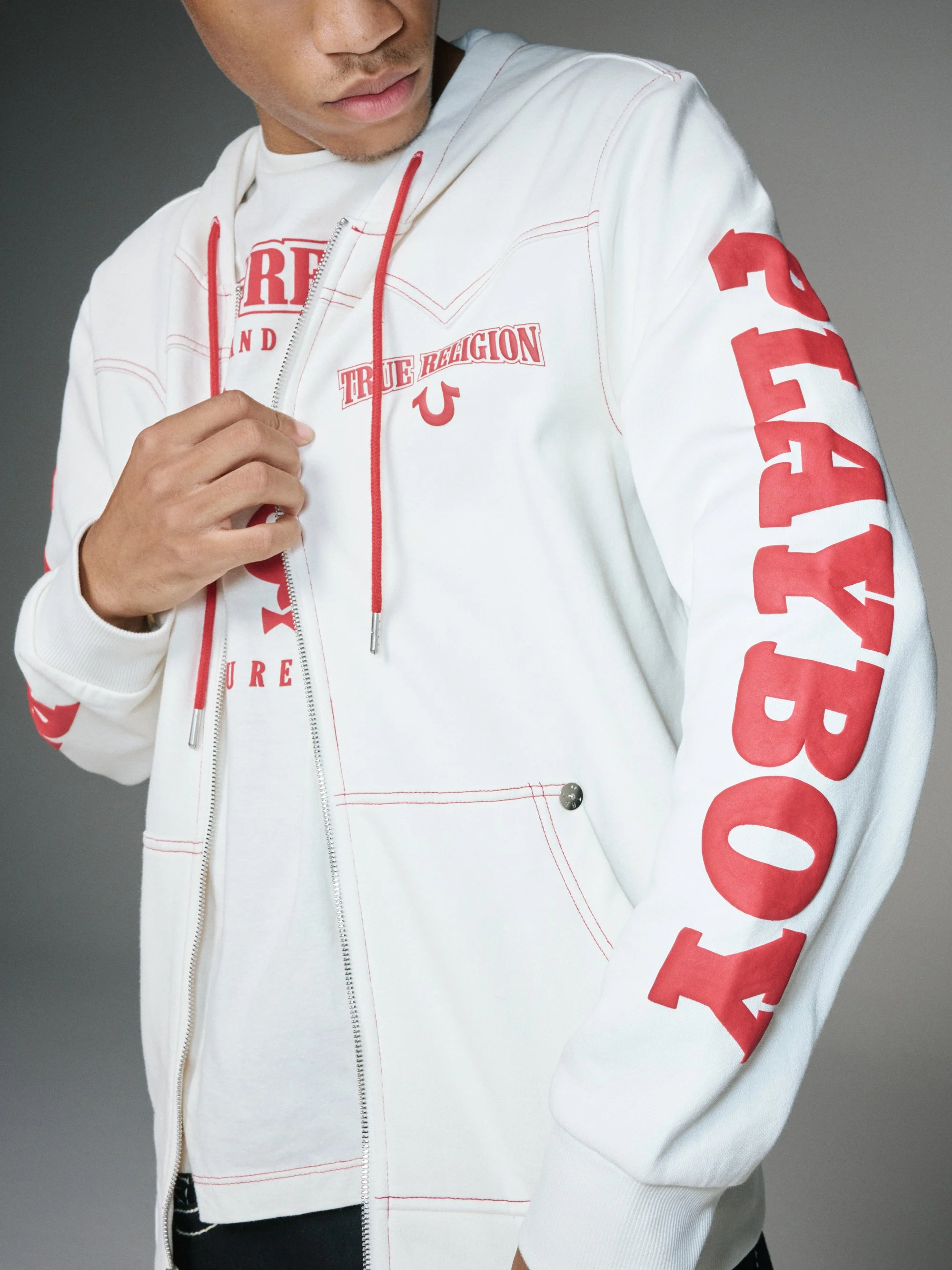 The True Religion × Playboy capsule blends True Religion’s premium denim and signature horseshoe codes with Playboy’s iconic Rabbit Head imagery, creating a multi-piece collection of co-branded denim, hoodies, tees, jackets, and joggers. The partnership reinterprets both brands’ cultural aesthetics — pairing Playboy’s bold, nostalgic edge with True Religion’s contemporary denim heritage — as a statement of attitude and crossover appeal.